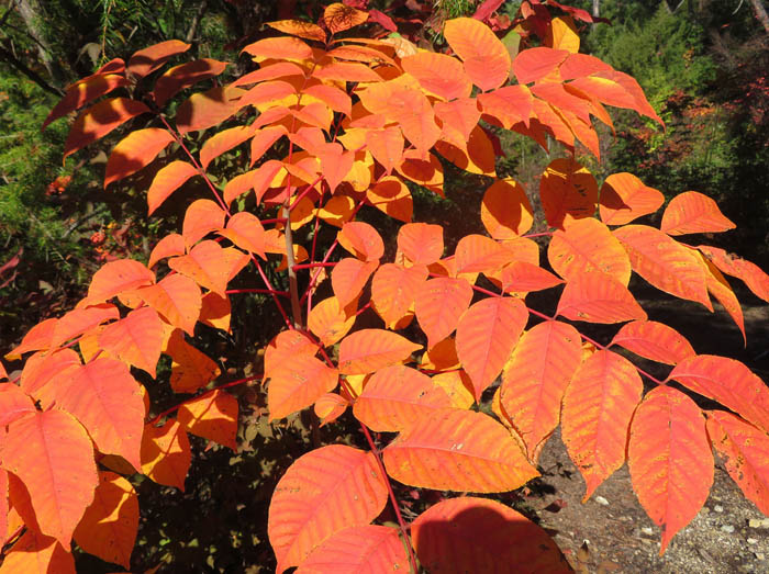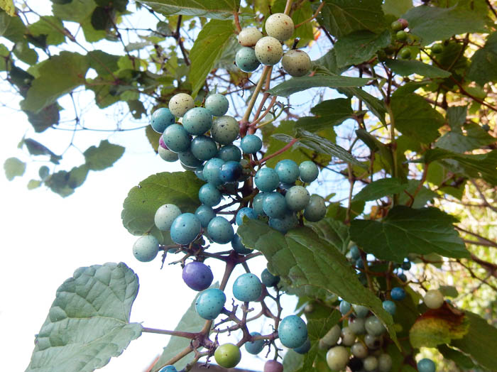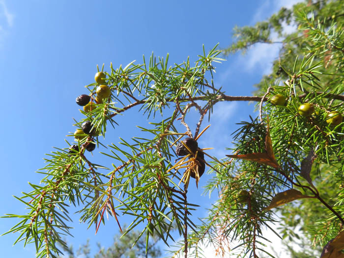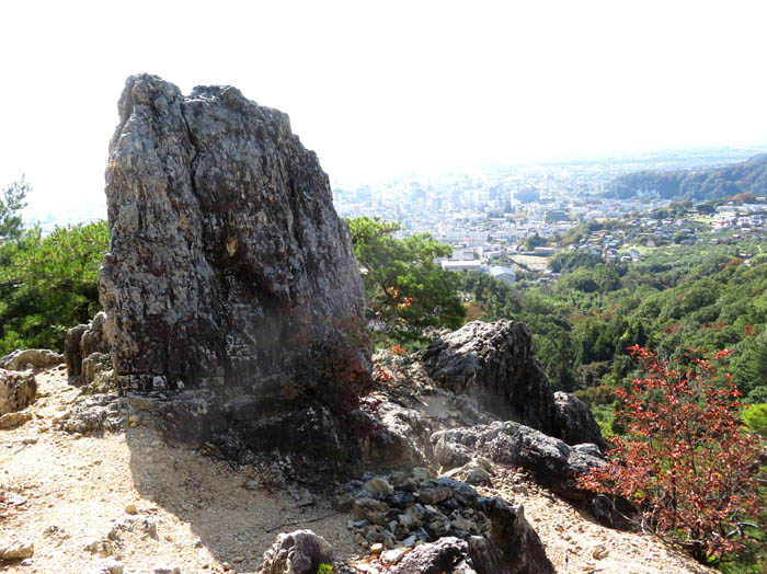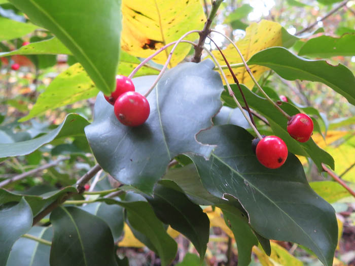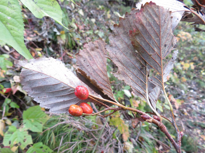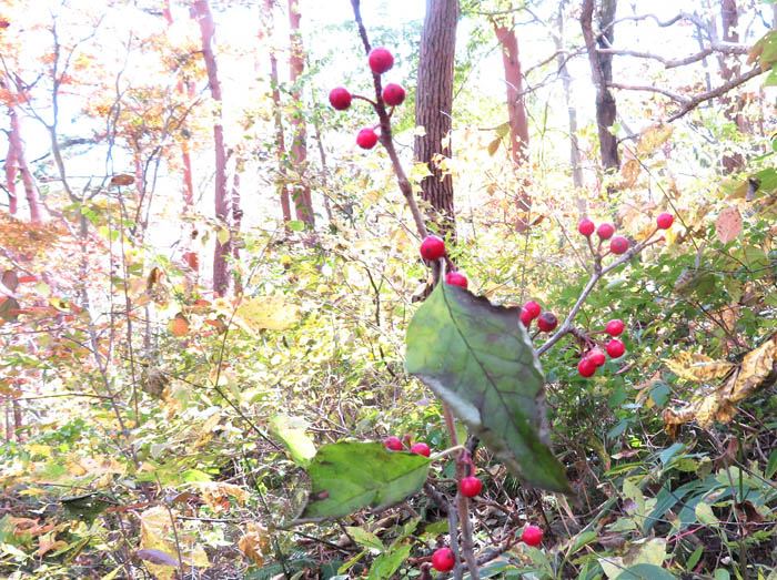 物見岩から長野市を見下ろす。周囲の色づいた木々の中で、ネズミサシの緑の葉は空に映える。ここで一服して、再び大峰山目指して登り始める。このあたりの道は峰と峰の間になるので、風の通りが幾らか弱かったのだろうか・・・などと話しながら行く。秋の気配を濃くしている木の葉の中に緑濃い枝が目立つ。ソヨゴだ。赤い小さな実をぶら下げている。秋深くなると、赤色の実が目立つような気がするが、木の実の名前はわからないものが多い。足元にはツルリンドウの赤紫の実が輝いている。雨も降らないのに露を宿している。今年はツルリンドウの実が多いような気がするが・・・。花の季節にも登っているけれど、地味なツルリンドウの花は他の草に隠れていて目立たず、赤紫の実には目を奪われる。