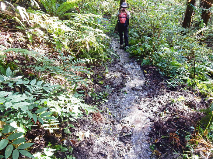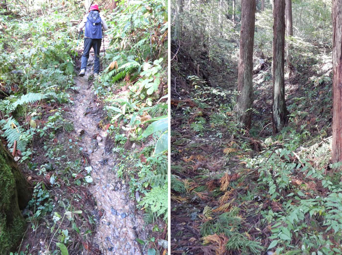 地附山との分岐を左に進んで、沢が近くなってくると、道に水が流れるようになった。何度も大峰山に登っているけれど、雨の後に登ってもこんなことはない。今回の雨はよほど大量だったのだろう。沢を流れる水音もする。下を見ると、白い波が見えるところもある。びっくりだ。