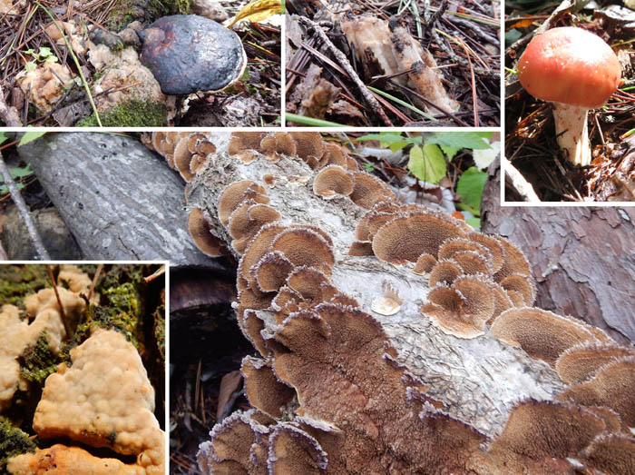 さらに進んで地附山との分岐辺りまで行くと、泥んこ道が出てきた。道の脇の切り株には苔や小さなキノコがたくさんくっついている。そんな中にどこか正体のしれぬ生き物が見える。粘菌だろう。最近夫が興味をもって山歩きのたびに探している。木が育つためには菌根菌の働きが大切だそうだし、様々な場所で生きている粘菌の働きも、見えにくい大切なものという。なんだか気が遠くなるようなミクロの世界だが、形になっていると面白い。湿り気が多いところの方に粘菌が見つけやすいようだ。