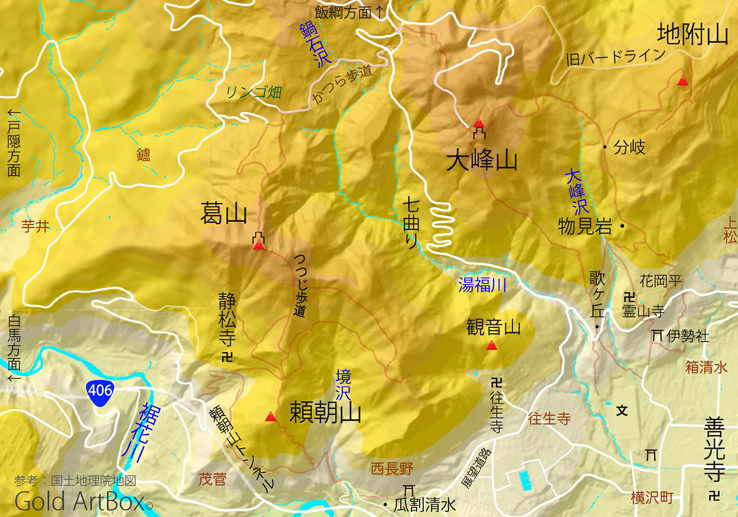 高度を上げていくと、広葉樹が黄色く染まっている。以前は赤松が多かった森だけれど、松くい虫の被害にあって、ずいぶん切り倒されてしまった。森がスカスカしている感じだ。左からの沢が細くなって近づいてくると、山道は左に曲がる。この辺りで沢は自然に消えるようだ。この小さな沢の源流にあたるところかもしれない。越えた右側あたりが少し湿り気を帯びた平らな土地になっているから、雪が多いとか、年間の平均雨量が多ければこの辺りは小さな湿原になる地形かもしれない。周りは杉林。杉の木もこの頃は勢いがないようだ。今日は台風の風の影響か、緑鮮やかな葉もたくさん落ちている。茶色く枯れた葉、黄色い葉、緑鮮やかな葉と彩り豊かな道になった。この辺りの斜面になると風の影響が強かったのか、大きな枝もたくさん落ちている。