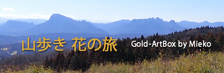 しばらく歩いて石尊山の直登コースを過ぎると、車道から外れて細い道を進む。小鳥の姿がたくさん見えたが、人の姿は見えない。湿地のような草ぼうぼうの土地、一面に広がったマント植物の下からわずかに花咲いている梅、枯れてぶら下がっているカラスウリの実。梅畑の脇に続くチャノキは花殻がたくさんついている。