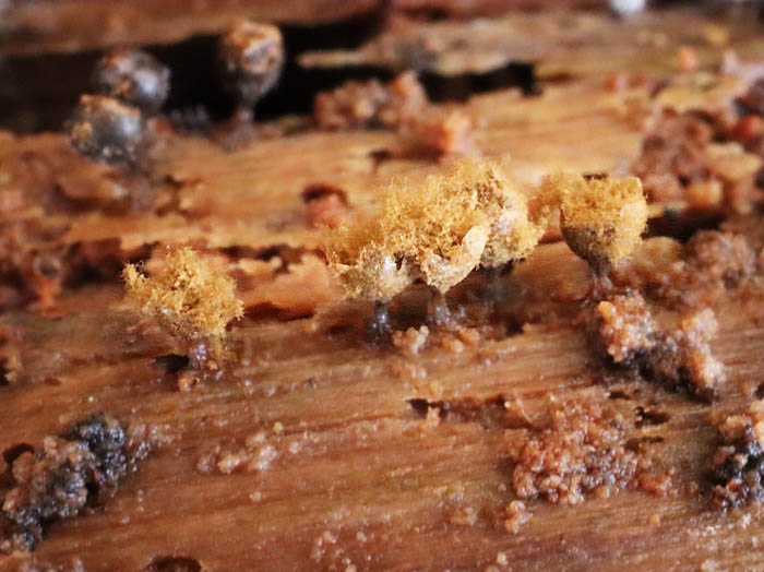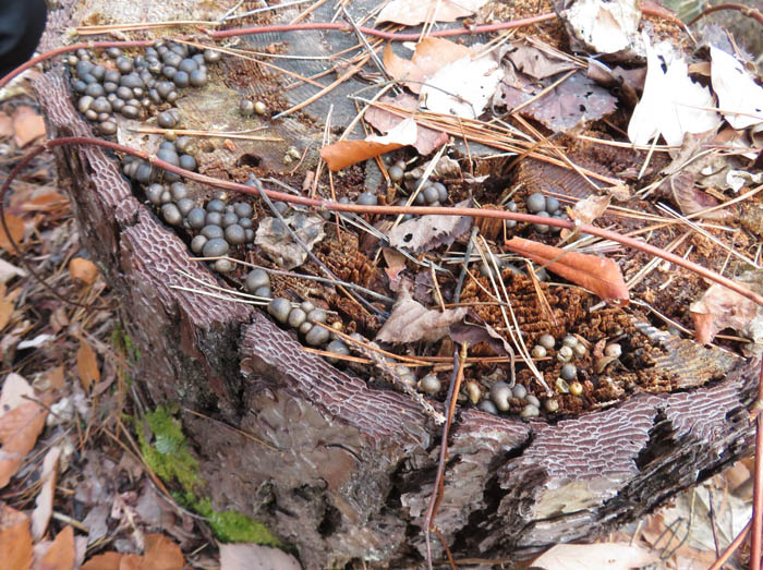 定点観察をしてきたホコリさんの近くにハチノスケホコリがたくさんいました。倒れて斜めに傾きそのまま腐った木の下側にいました。何度も来ているのに分らないものです。本にはしゃがんでよく見ているといろいろ見えてくると書かれていました。しゃがんだり、立ったりを何度もやると体に応えます。