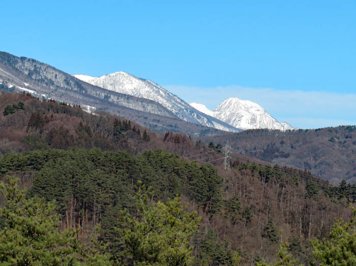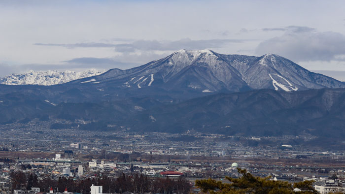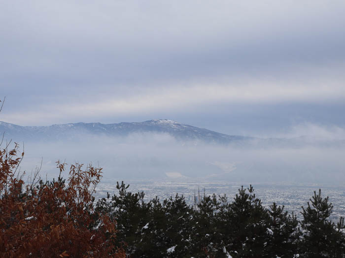 🔽 頂上からの景色は霞んでいましたが、裏山の地附山からは隠れてしまう群馬県の山も角度が変わるので、見えました。