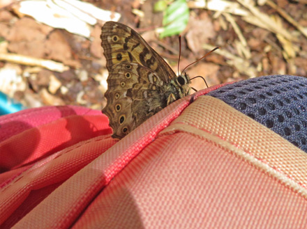 カンバの梢が空に広がっている。1時になろうというところ、いい時間だね。買って来たおにぎりを頬張っていると、群れ飛んでいた蝶の1頭が私の鞄に止まった。可愛いけむくじゃらな顔、長い口吻でカバンを突いている。ヤマキマダラヒカゲかな。おにぎりを食べ、おしゃべりをし、さて帰ろうかと見ると、蝶はまだ止まっている。ちょんちょんと鞄を動かすが、飛び立たない。美味しい匂いがするのかな。ようやく飛んで行った蝶にお別れを言い、私たちは来た道を戻った。