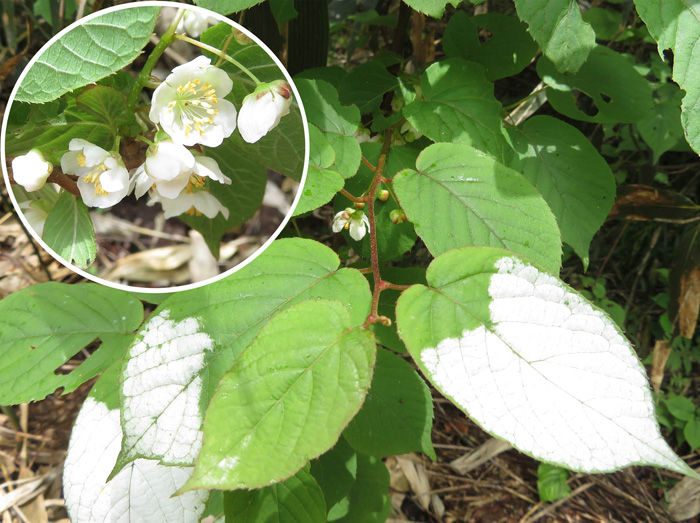 この時期山道を通ると、白く輝く葉が目立つようになるマタタビだが、その花を近くで見たことがなかったので、どこへ行ったら見られるだろうかと思っていた。こんなところで会えるなんてラッキー。