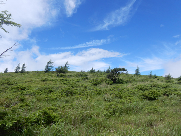 家を出たのは渋滞を避けて8時半、長野自動車道を走り、塩尻ICで降りる。高ボッチスカイラインに入る道を角に立ててある看板に従って進むと、最後の曲がり角に車両通行止めの看板が。「えっ、長雨の影響か」。前を走っていた軽自動車がUターンをするのを待っていると、運転席の老人が窓から顔を出して、「それじゃ、あっちの道から登るしかないよ」というようなことを話して走っていった。「別の道があるんだ」「よしついて行こう」。軽々と登っていく軽自動車を、時々見失いながらも追いかけ、いつの間にか高ボッチへの案内が出ている道を走っていた。