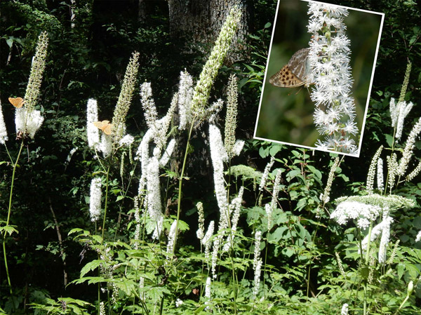 サラシナショウマが純白の花穂を惜しみなく立てて、ヒョウモンチョウがたくさん集まって来ている。あまり見たことがない蝶もいる。ウバユリも、オオナルコユリも花は終わって実になっている。シシウドみたいな花火のような花も群れていて豪華だ。後で調べていたら、ヒュウガセンキュウと言うらしい。初めて聞く名前だ。シラネセンキュウという花は見たことがあるけれど・・・花の分類は難しい。
