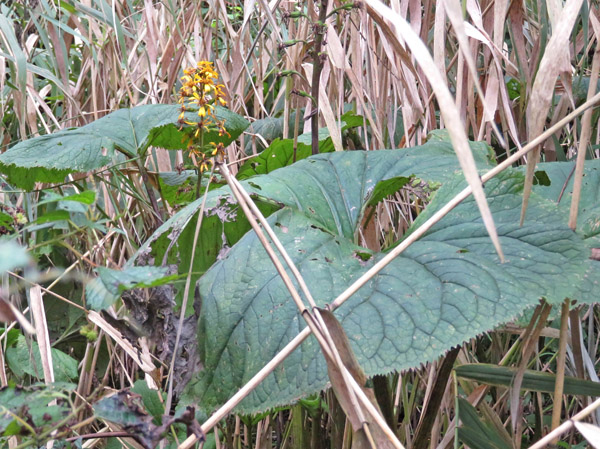 私たちが選んだ袴岳は思っていた通り、人が少ない。どちらかというとマイナーな山、知る人ぞ知るという感じかな。少し歩くと、袴湿原につく。小さな湿原に秋の色が広がっている。イヌツゲの木が多くなって、湿原が乾いていることを感じる。木道を進んで水辺の道に出る。丈高いアシなどの奥に黄色い花が咲いている。メタカラか?オタカラか?葉っぱが大きい、そして花びらに見える舌状花がたくさんある、これはオタカラコウでしょう。春にはミズバショウやサンカヨウが一面に咲く水辺に、ミズバショウの葉だけが巨大になって隠れんぼをしているようだ。