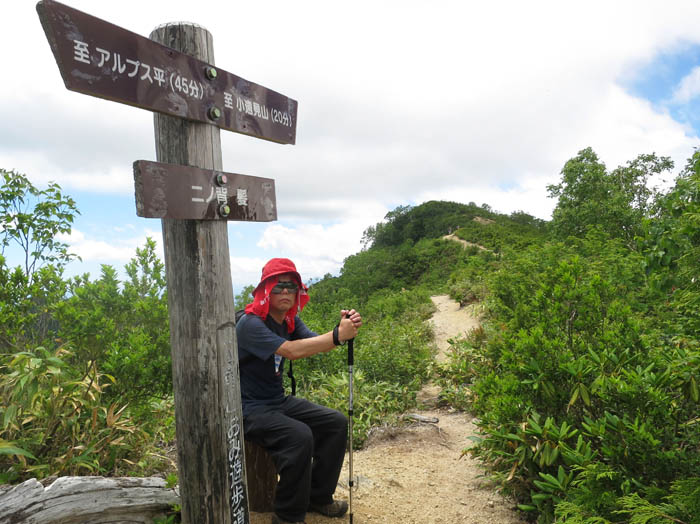 とにかく暑い暑いと言いながら「一ノ背 髪」に着いた。標高1892m。木のベンチがあるので、小休憩。ここで出会った男性は「今日は異常だ。こんなに標高が高いところでこれほど暑いなんて珍しい。小遠見まで行こうと思っていたけれど、今日はここまでにするよ」と言って、荷物を広げていた。
