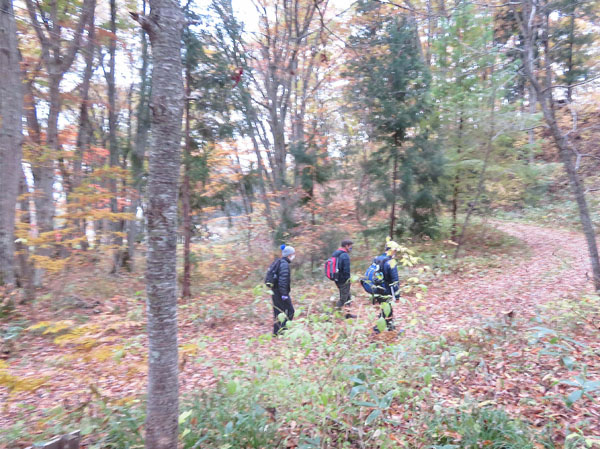 しばらく森を感じながらたたずみ、紅葉が始まった森の奥へ進む。『おとうちゃん』という名札をつけた案内のお兄さん(?)のユーモアのある語りにも耳を傾けながら、少しずつ森の奥へ入っていく。11月の黒姫山麓はすでに冬の気配をまとい始めている。落ち葉に埋もれそうな道を歩いているとキノコや粘菌が働いていることを感じる。菌類が活発なことも樹木の成長に欠かせない。