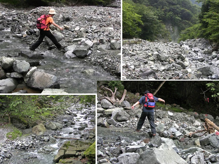 さて、広い沢を歩き始めると、いきなり渡渉がはじまる。水が少ないからいいけれど、ちょっと雨が降ると渡れなくなってしまうだろう。苔むした崖を登り、何度も渡渉を繰り返す。冒険心がくすぐられて気分は踊る。ただ暑い。汗っかきの夫は頭から水をかぶったように汗びっしょりになっている。