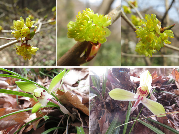 毎年訪れているが、少し早すぎたり、逆に遅すぎて実になってしまっていたりする。今年はまさに満開だ。散策ルートがわずかだけれど広がっている。しかも見上げると旭山の斜面にピンクの絨毯を敷いたようにカタクリが登っている。群生する範囲がずいぶん広がっている。ダンコウバイより淡い色合いのアブラチャンだが、斜面を覆い尽くすように咲いている空間はほのかな色彩で美しい。