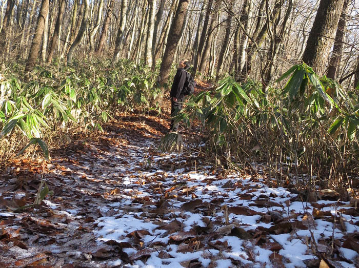 道は緩やかで、枯れ葉色に包まれている。所々クマザサが張り出しているが、斜面は落葉低木樹と、草紅葉で明るい。赤や黒の実が沢山見えるが、これらも雪の下になって土に還っていくのだろう。いくつ新しい芽を出すのやら。