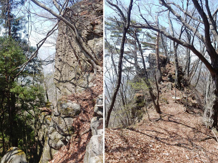 尼厳山との鞍部で道を分け、奇妙山を目指す。スミレが咲き溢れるような斜面をもうひと頑張りで稜線に登り着く。いつも花の写真を撮りながら歩くので、標準タイムをあまり気にしていないのだが、珍しく夫が「よし、コースタイムとぴったりだ」と喜ぶ。ここには出会いの石というのがある。この稜線を左に下っていくと大室古墳登山口までの長い道のりだ。岩沢コースとの出会いの場所というわけか。私たちは右へ、奇妙山を目指す。森の中の狭い尾根が、登るにつれさらに狭まってくる。そしてついに、右斜面は切り立った岩になってきた。