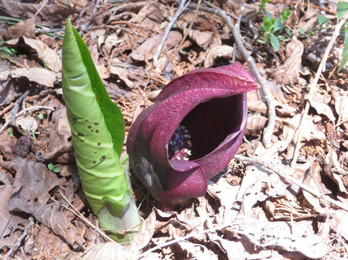 ザゼンソウは、葉が出る前に独特の形の赤紫の花が地面にぽつりと座っているように出てくるのが面白い。その姿が座禅をくんだ僧の姿に見えるから座禅草。4月の後半では少し遅いかと思ったが、葉が開き始めてもその足元に可愛い赤紫の花がチンと座している姿もまたいいので、急いで支度をして9時前に家を出た。