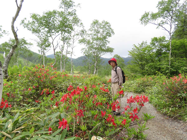 湿原の広がりはシラカバの白い幹とレンゲツツジのオレンジで彩られている。見事な彩りをカメラに収めていたら、一人優雅に歩いてきた年配の男性が「お二人、お撮りしましょう」とニコニコ。思わず「お願いします」と、カメラを渡した。ありがたい。