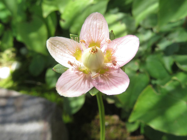 センターの話をしながら地附山公園から歩き始めようとしていると、作業をしていた人が振り向く。入り口の管理棟の前に花壇を作っている西澤さんだ(※)。花壇の花を見ながら少し立ち話をする。山頂のウメバチソウが開いたか見に行くのだと話したら、花壇に咲いたベニバナウメバチソウを教えてくれた。淡いピンクの大輪の花がいくつかの蕾を従えてのびやかに花開いている。初めて見る、色のついたウメバチソウにびっくりした。西澤さんにお礼を言って、登り始める。道の端に、ツユクサの青が綺麗だ。