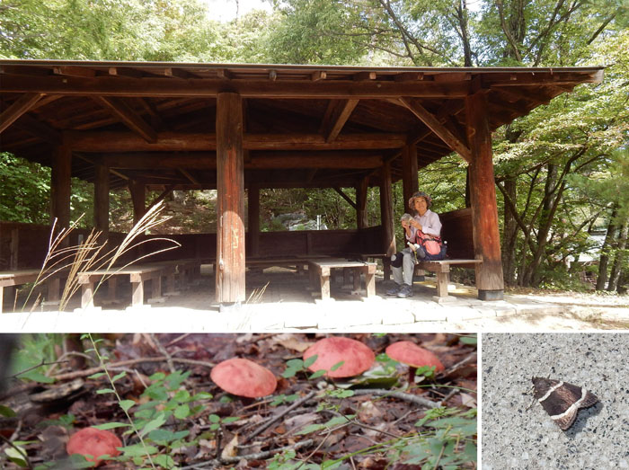 ブランド薬師の先には立派な東屋があるので、ここで休憩。おやつを食べることにした。ふと見ると、直径20cmほどの大きなキノコ、脇にはまだ小さいけれど同じキノコが並んで立っている。その傘の縁は綺麗な紫色だ。大きくて、そろそろ役目を終えそうな方のキノコの裏を見せてもらう。こんなに綺麗な紫色のキノコは初めて見た。