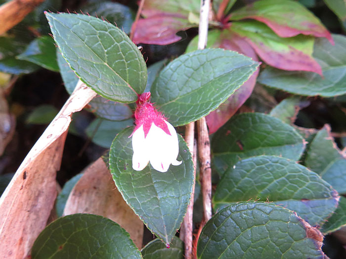 稜線までの登りは短いが急だ。前日に雨が降ったせいか、水溜りがある。全体にぬかるんで滑りやすい。粘土質の土なのか、水捌けが悪いようだ。鉢山分岐まではあっという間、左に折れ、長い稜線を歩く。ほとんどアップダウンのない道は楽ちんだったが、ネマガリダケが両脇に茂っていて視界が効かないのがつまらない。笹の上に伸びる針葉樹やダケカンバ、ナナカマドなどの枝振りを見て楽しむしかない。花はもう見られないと思っていたが、アカモノが一輪咲いていたのでビックリ。急激に変化する気温に惑わされたのだろう。