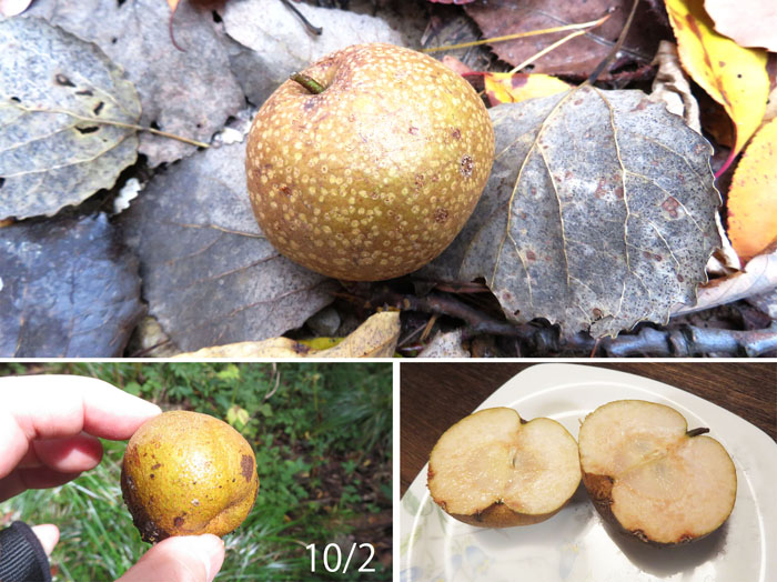 一体幾つの実が春になって芽を出すのだろう。スマートなコナラ、まん丸いクヌギ、形のいいのを拾って帰ろう。孫が喜ぶだろう。地面を見て歩いていたら、ヤマナシがぽとりと落ちている。どこから見ても梨だ。枝についているのを見たいと思って見上げるのだが、いつも首が痛くなるばかりで見つけられない。先日は家に持って帰って切ってみた。とても美味しそうに見えるのだが・・・硬くて粒々が多くて食べられるものではない。でも味は悪くない。酸っぱくて爽やかだ・・・、舐めるだけなら。