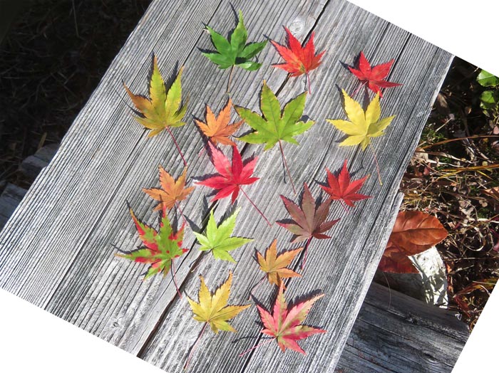 カエデは木によって色が変わる時期が異なる。だから緑濃い木もあればオレンジ色に染まり始めた木もある。そしてその隣には真っ赤に輝く木もある。その変化を見ながら歩くのは楽しい。色の異なるカエデを集めて水に浮かべて楽しんだこともある。今年は拾いながら登って山頂のベンチに並べてみた。