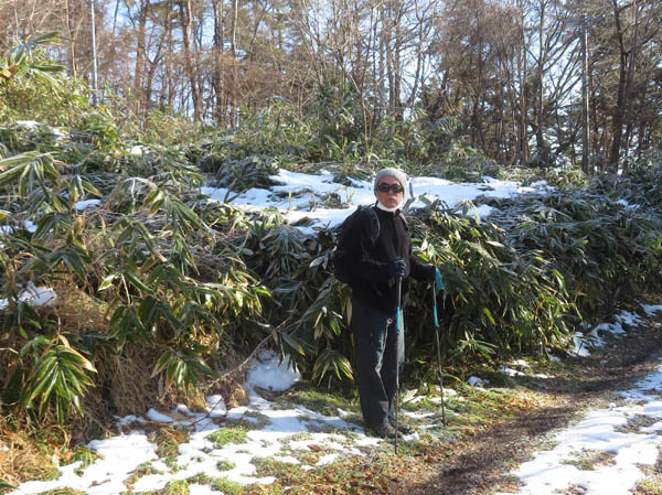 どこへ行こうかと迷い、茶臼山にしたのは雪のないあったかい山道を歩けると思ったからだったが、先週末いきなり降った雪は多かったようで、茶臼山にも予想外にたくさん積もっていた。植物園から登ろうかと話しながら行ってみたが、3月まで工事のため通行止めとの表示、有旅茶臼山登山口へ車をすすめた。