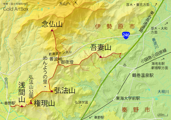 大山から南に伸びた尾根が、街にぶつかって最後の丘陵地になった辺りがハイキングコースになっている。この丹沢山に連なる吾妻(あずま)山、弘法(こうぼう)山、権現(ごんげん)山、浅間(あさま)山の縦走は、人気の低山歩きらしい。秦野駅近くの弘法山は広い山頂部が桜の名所として有名だ。縦走路はその弘法山から吾妻山まで続き、鶴巻温泉駅に降りる。家から行くには鶴巻温泉駅が便利だったので、いつもそこから歩き始めた。