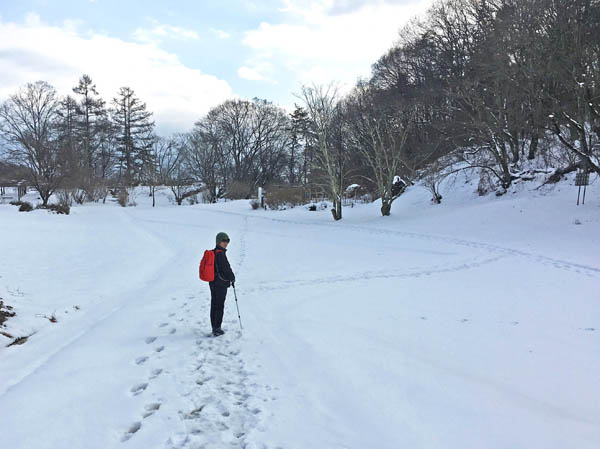 足元を整えて歩き出す。雪は降っていないけれど、刺すような冷え込みだ。雲が多くて太陽が顔を出さないからだろうか。私たちは植物園の中に入っていく。自然の起伏を利用して作られている植物園も、今は真っ白。いろいろな木が雪の中に立っている。遊具もあるが、もちろん今は雪の中に埋もれている。冬季は閉園されているが、山へ向かう人は自由に歩いているらしく踏み跡が残っている。私たちはぽつりと続く一人の足跡らしきものを頼りに脇に入ってみた。そして踏み跡のないような緩やかな勾配を歩いた。雪の量はそれほど多くないのでどこを歩いても行けそうだけれど、広い園内を彷徨うのもつまらないので再び踏み跡に戻った。