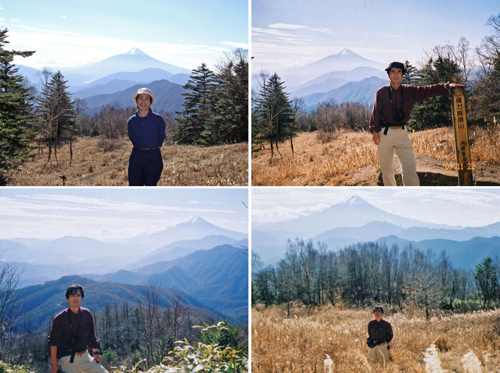 ここからは気持ち良い原をわずかに登ると山頂だ。到着11時50分。富士の方向に開けた見晴らし、そこに五百円札撮影場所の看板が立っている。朝7時過ぎに撮ったという写真は、11月初めなのに中腹まで白くなっている。目の前の富士は、昼に近くなって日差しが陰ってしまっているから、早朝日が当たる時の鮮明さはないけれど、雄大な姿は眺めていて飽きない。最初に目に入った時から、ススキ原で、山頂でと、私たちは何回も富士の写真を撮っていた。