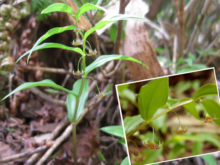 ゲレンデの右に左に、山道が整備されている。標識はないが、登山道以外はネマガリダケがびっしり覆っているから、開けているところに入ればよい。もう山頂近く、針葉樹が増えてきた。数日前の強風の影響だろうか、枝が沢山折れて落ちている。倒木も何カ所かあった。針葉樹林に咲くというイチヨウランが一カ所に群れて咲いているのを発見、大喜び。そして、森の妖精ミツバオウレンもびっしり咲いている。タケシマランも小さくて見落としてしまいそうな地味な花を沢山ぶら下げている。雪解け後の水が残っているところにはイワナシがピンクの花をつけて、これまたどこまでも登山道の淵を飾っている。