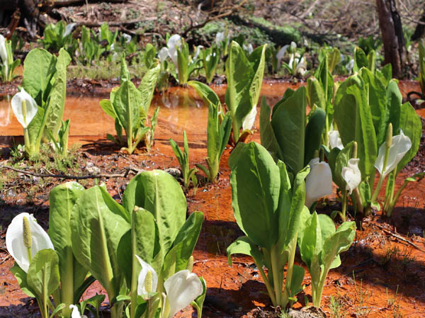 さらに森の奥へ進むと、森が明るくなったようだ。ミズバショウの白い花が一面に揺れている。群生地が奥へ広がったのか、斜面の奥まで木々の間を白く染めている。気がつくと所々の水が赤茶色に光っている。場所によっては油を流したように見えるところもあるが、これは汚れではない。鉄バクテリアが働いているのだ。