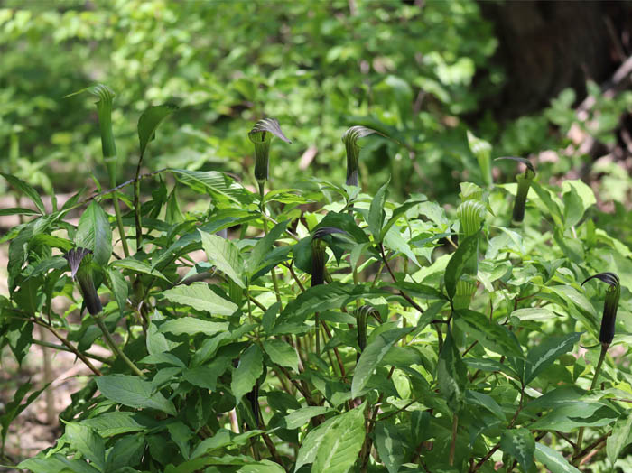 逆谷地湿原の入り口に車を停めると森の息吹に包まれる。木々が瑞々しい山の空気を惜しげなく噴き出しているようだ。 山フキの葉が一面に広がり、その緑の波の上に白い綿毛の穂が揺れている。足元にはツボスミレ、カキドオシの花。前に来た時は足元ばかり見て歩いていたので、湿原の入り口の道標を見落として先へ進んでしまった。立派な道標なのに・・・と、我ながら呆れるが、しばらく森の中を彷徨い、『善光寺の森』などというものを見つけたから道迷いもまた面白い。