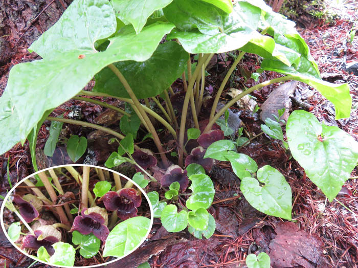 みどりが池の周辺はカエルの鳴き声で賑やかだ。ウスバサイシンの花が地面にコロリところがっている。