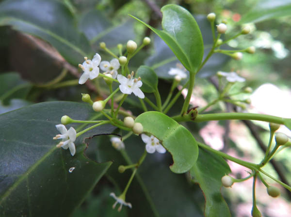 19日に登った時にはまだ開いている花が少なかったツルアリドオシの花が満開だ。純白の星が森の中に散らばっているようだ。そんなことを話しながら歩いていたら、本当に星形の花がある。花の先は4裂するのだけれど、5裂している星形のものが意外と多く見つかった。ツルアリドオシは筒型の2個の花が下の方で合着しているから、果実も赤い実に2個のポチポチが残り合着したことがわかる。2種類の花があって、私は雌花雄花と呼んでいたが、長花柱花、短花柱花と呼ぶらしい。