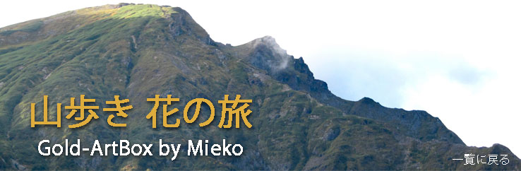 時々薄くなった白いカーテンの裾模様のようにオキの耳に続く稜線が霞む。秋色に染まっている。しばらくそうしているとご褒美のように一瞬視界が開く。すぐそこに肩の小屋が見えている。樹木はないが、岩を覆う草花によって稜線は彩られている。