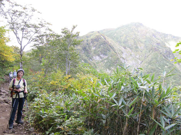 標高はそれほど高くはないが、険しい山容と、豪雪強風地帯に切り立つ山だから高木樹林はない。灌木や笹に覆われた山肌が秋の色に染まっている。岸壁の黒い岩肌と対照的だ。