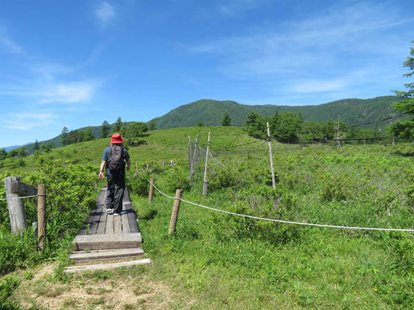 甘利山の駐車場に到着。レンゲツツジが有名なところらしいが、花の季節は終わり。変わって濃い紫のアヤメの花が咲いている。鹿の食害を避けるためのネットが張り巡らせてあり、必要なこととはわかるが、残念な景色となっている。