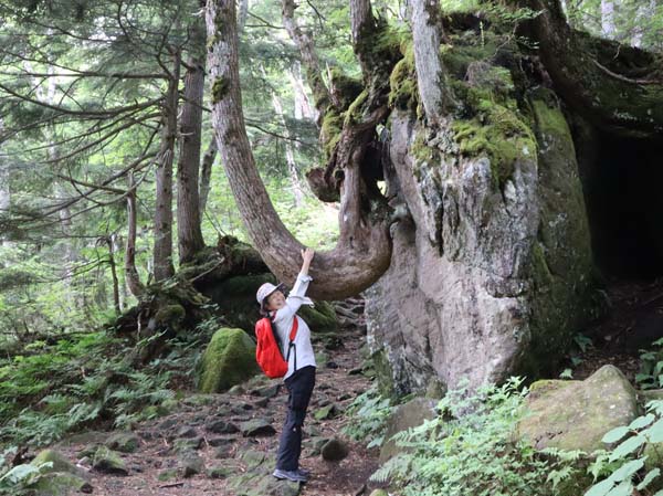 平日だけれど、行き交う人の数は多い。深い森に佇む岩の上の巨木を見上げながらゆっくり歩いている。