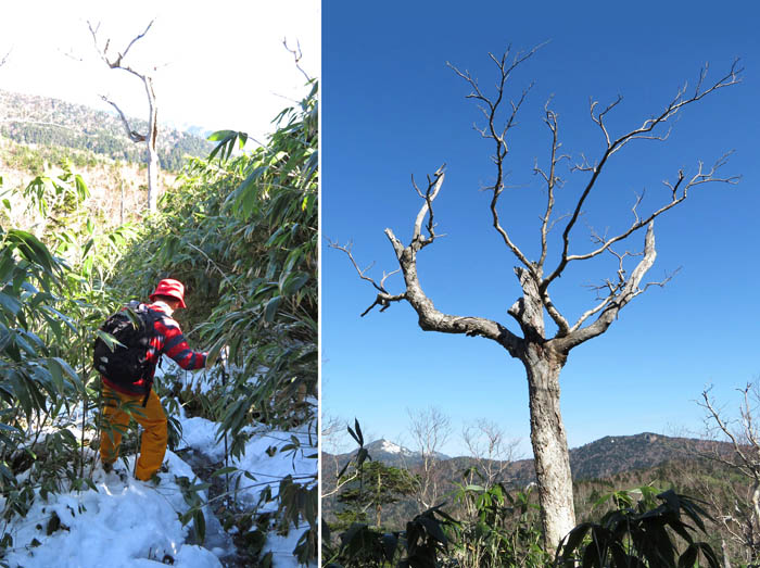 案の定、何回か滑り、1回ずつなかよく水に靴を潜らせて、四阿に着いた。途中森の切れ目からは岩菅山のカール地形がきれいに見えた。目の前の赤石山もきれいに見えて、その奥には幾重にも連なる山々・・・群馬から上越国境方面、さらに右には赤城山の姿も見える。快晴の空に、何本もの立ち枯れた木がおもしろい形でそびえている。