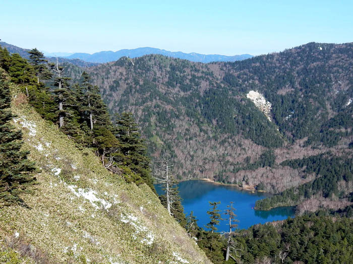 ぐんぐん登って志賀山との分岐を過ぎるとすぐ、右下にぽっかりと視界が開ける。大沼池がきれいなエメラルドグリーンに輝いている。対岸の赤石山も立派だ。鉢山の途中からは見えなかった上州の南方面まで開けている。妙義山のでこぼこした稜線も、榛名山の峰々も見える。北は遠く雪をいただいた平らな峰、あれは苗場山かなぁ。