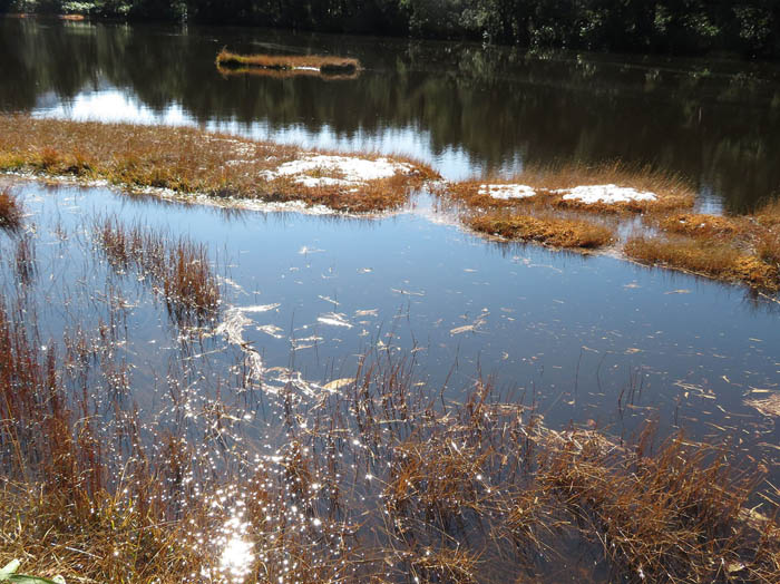 標高1800mにある渋池は浮き島に雪が積もり、端の方には氷が張っていた。氷が幾何学模様のようになっていて面白い。この標高でハイマツは珍しいと思うが、ここにあるのは氷河時代の遺物なのだそうだ。太陽を反射して水面がキラキラ光る。空気が澄みきっている感じ。