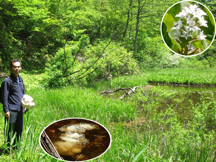 話を戻そう。池の向こうに咲き誇るミツガシワが水面に映る様を見ていると、別天地。小さな池だが、周囲を森に囲まれ、私たち以外誰もいない。聞こえるのはカエルの鳴き声と鳥のさえずり。