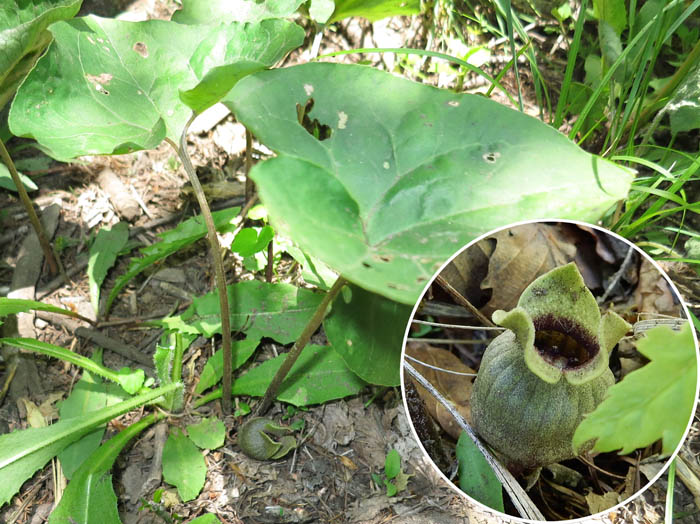花々を楽しんで歩いていると、大きな葉が目に入る。『葵のご紋』、葉の下を覗いてみると咲いている、小さな壷形の花。カンアオイは地域によって様々に進化したそうで、種類も多いそうだ。袴岳のカンアオイは緑がかった親指の頭大で、壷の先に開く3枚の萼裂片が小さく波打っていた。いままで見たカンアオイの中ではもっともかわいい形。夫はこの地味な花はどうやって交配するのだろうと首を傾げている。
