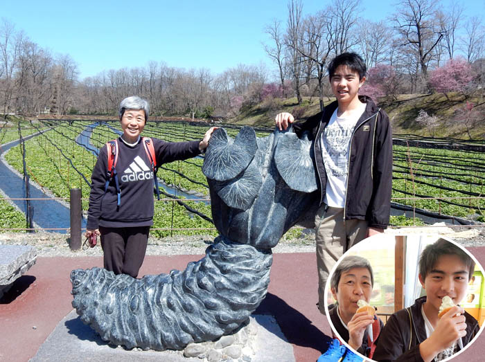 春休みにやってきた孫とちょっと遠出をして安曇野の『大王わさび農園』に行ってきた。美味しい蕎麦屋さんがあると聞いていたので、そこで蕎麦を食べてから行こうと、地図を頼りに走った。常念岳が間近に見える安曇野の疏水脇にあった蕎麦屋さんで孫の大好きな天ぷら蕎麦を食べたが、ご馳走様をして出たら、「本日の蕎麦は終了しました」の張り紙が出ていた。ギリギリセーフだったようだ。蕎麦屋さんの人にお店の前で写真を撮ってもらい、アルプスを背景にした疏水脇を散策してから大王わさび農園を目指した。