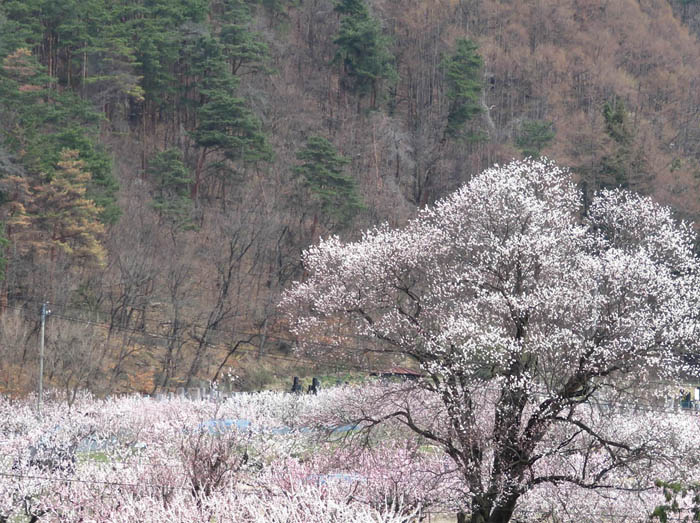 4月に入ってすぐ、千曲市森の『あんずの里』まで出かけた。もう十数年前に1回訪ねたことがあったが、まだ花には早い時期で、蕾が薄桃色に枝を染めていたことを思い出す。傾斜地のはずれ、斜面に近いところには在来種だという背の高い自然木があって、その姿に心が惹かれた。