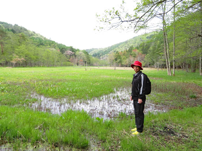鉄バクテリアが多いのか、見渡す限り赤茶色の湿原にきれいな緑のミズバショウが群生する様子は、神秘的だ。葉が大きく育っているので、白い花は隠れているが、リュウキンカの明るい黄色は遠くまで輝いている。入り口にはニリンソウが一面白く咲き広がり、足の踏み場がないくらい。古い案内書を見ると木道が西の端まで続いていると書いてあるのだが、今は水の中に朽ちて消えている。
