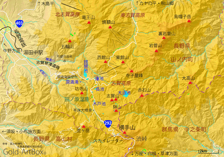 さて、我が家のカレンダーの10月写真は紅葉に囲まれた澗満滝(かんまんだき)、志賀高原の入り口に展望台があるという。その写真を見て、ちょうど良い季節だからここへ行ってみようと友人が言う。せっかく行くのなら横手山まで行ってから帰ろうと話した。横手山は山頂までリフトで行けるうえに、素晴らしい大展望が望める。冬はスキー場になるが、最も標高が高いゲレンデらしい。