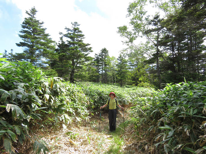車道が終わるといよいよ山道、右に根子岳、四阿山を見ながらの道は深い笹の中に続いている。緑に光る笹原に、ウラジロモミなどの針葉樹が濃い輪郭で立っている。笹は幅広く刈り込まれ、ゆっくり話しながら歩けるのは嬉しいが、笹の背が高くなると、見晴らしはなくなる。黙々と歩く。ほとんど傾斜がないかと思える道はしかし、意外に凸凹していて水たまりがたくさんある。コケや、シラタマノキ、イワナシ、マイヅルソウなどが一面に生えていて「ごめんなさい」と言いながら踏んで歩く。シラタマノキは絨毯のように道の縁を飾っていて驚く。コケモモの木も多いが、実は少ないようだ。アカモノとコケモモが、赤いアクセントになっている。