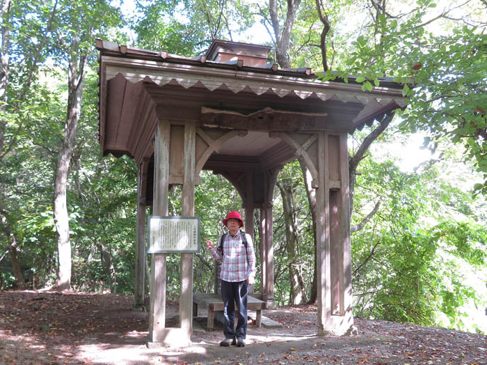 駐車スペースに着いて歩き始めると緩やかな傾斜の上に小さな四阿が立っている。「ここはもう山頂なんじゃない」「本当に車が登る山なんだね」などと言いながら四阿に行ってみる。