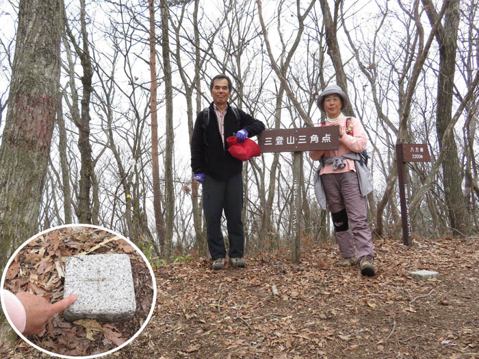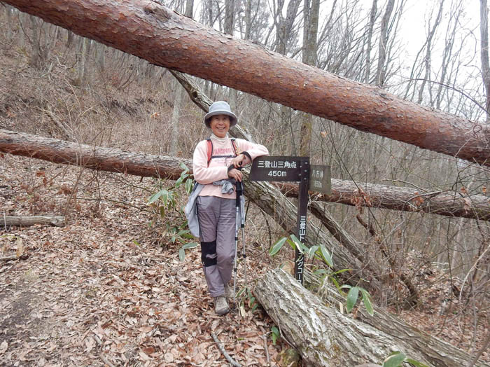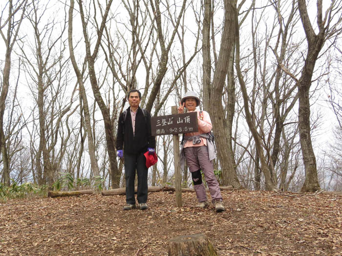 途中古い林道に飛び出し、また山道に入り、緩やかな稜線をしばらく登ると三登山の三角点に出る。森の中の広い稜線だが、風が強い。雲も多いので、疲れている夫はここから引き返そうと言うかと思ったら、「せっかくだから山頂まで行こう」と言う。三角点からは5分ほどで、三登山山頂の看板がある広場に到着。ここで持参のアンドーナツを食べようと楽しみにしていたのだが、風が強い。記念写真だけ撮って、風を避けられるところまで下る。
